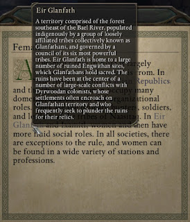 Yikes! That's a lot of words. All the descriptions together are about 330 words, much of it references to random game locations the player has no knowledge of. "Ein Glanfath" "Dyrwood" "Glanfathan" "Ixamitl" "Naasitaq" How can anyone get anything coherent from this tangle? This is literally the second thing the game shows you.